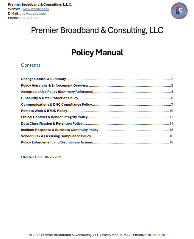 Premier Broadband & Consulting, LLC (PBCLLC) Policy Manual