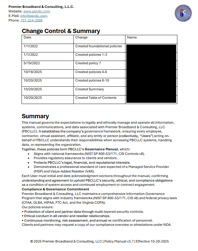 PBCLLC’s Policy Manual aligns with recognized national frameworks including NIST SP 800-53/171 and CIS Controls v8.
